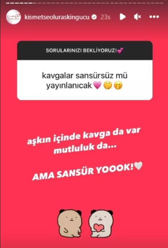 Sorulara cevap veren sayfa yönetici, kavgaların sansürsüz yayınlanacağını söyleyerek “Aşkın içinde kavga da var mutluluk da. Ama sansür yok” dedi. Yarışmanın kurgu olup olmadığıyla ilgili iddiaya da açıklık getiren yönetici, “Kurgu istesek dizi yapardık. Burada her şey gerçek” ifadelerini kullandı.